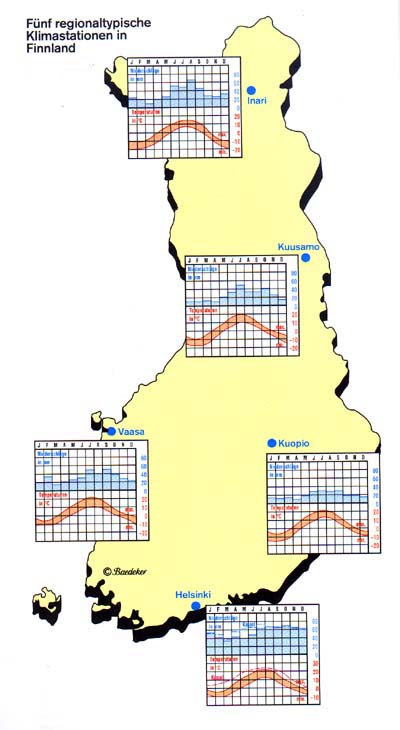 kann man erkennen, dass das Klima nach Norden hin, nach Lappland, kontinentaler wird. Inari - das Kontinentalitätszentrum Skandinaviens - weist eine jährliche Temperaturschwankung von 26,7 Grad Celsius und eine Niederschlagsmenge von 405 mm pro Jahr auf. Die Vegetationsperiode (Tage mit durchschnittlichen Temperaturen von über 5 Grad Celsius), die im Süden noch 175 Tage beträgt, geht hier auf 120 zurück; damit sind die nördlichen Grenzen des Getreideanbaus überschritten.