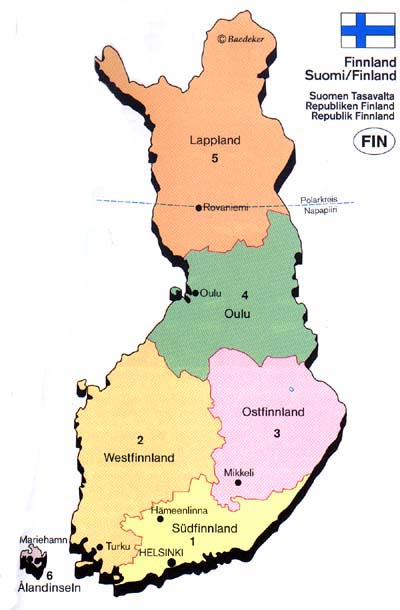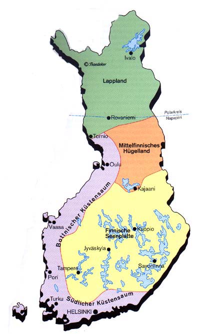 Finnland ist nicht gleich Finnland - wie schon die Verteilung der Bevölkerung auf das Land zeigt. Die Einteilung kann sowohl in Naturräume wie auch politische Regionen vorgenommen werden. Um die abgebildeten Karten in vergrößerter Ansicht anzuzeigen, einfach auf die entsprechende Karte klicken.